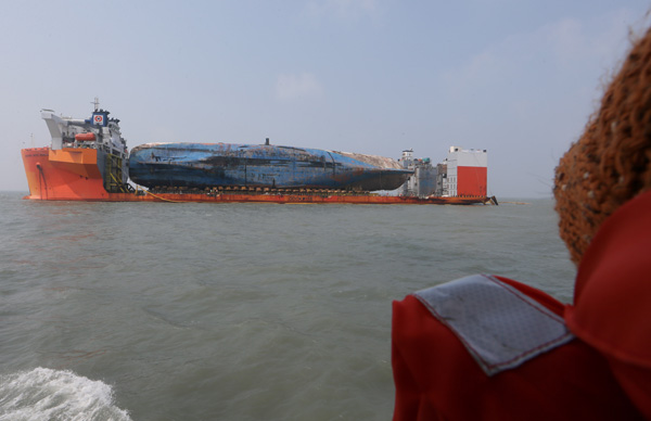 세월호 미수습자 가족들이 27일 오전 전남 진도군 세월호 사고 해역 인근에서 반잠수선에 실려 마지막 항해를 위해 해수 배출 등 준비작업 중인 세월호를 바라보고 있다. 세월호는 배수와 방제 작업을 마치고 30일 전후 목포신항으로 출발한다. /연합뉴스