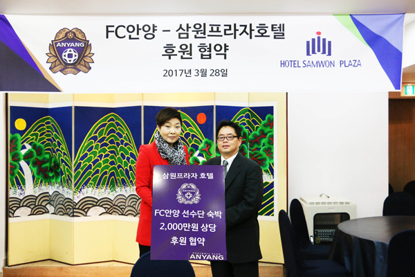 삼원프라자호텔은 이번 협약을 통해 연 2천만 원 상당의 매 홈 경기 1일 전 숙박 비용을 FC안양에 후원하기로 합의했다.
