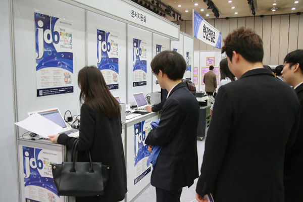 29일 고양 일산 킨텍스 제2전시장에서 열린 ‘청년드림 잡 페스티벌’에서 청년 구직자들이 현장에서 이력서를 만들고 있다./연합뉴스