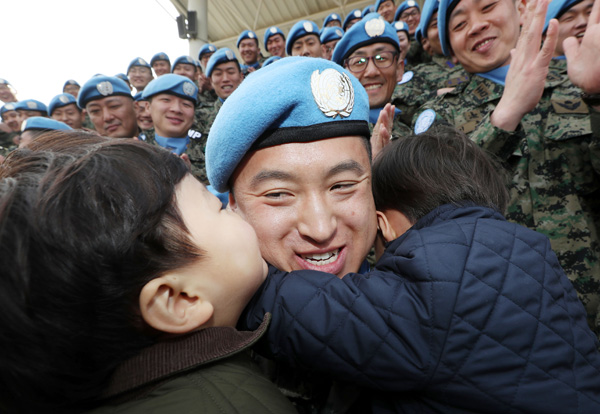 29일 오후 인천시 계양구 국제평화지원단에서 열린 ‘동명부대 19진 환송식’에서 한 부대원이 자녀들과 작별인사를 하고 있다. /연합뉴스