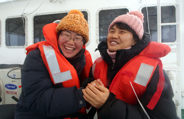 29일 전남 진도군 동거차도 인근 세월호 작업 현장으로 향하는 경비정에서 미수습자 조은화양의 어머니 이금희(왼쪽)씨와 허다윤양의 어머니 박은미씨가 ‘세월호 미수습자 지원법 국회 법사위 통과’ 소식을 듣고 기뻐하고 있다./연합뉴스