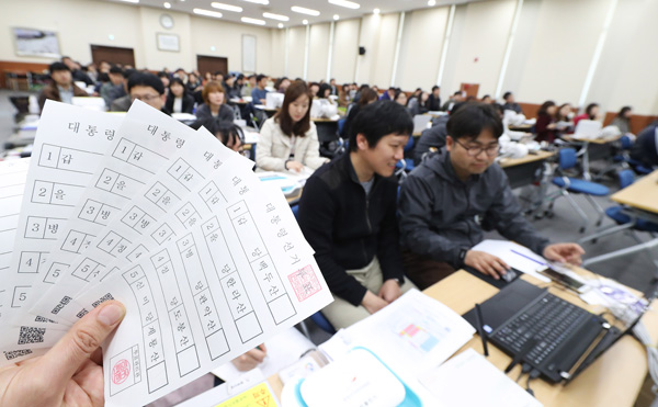 3일 오후 수원시 영통구 경기도선거관리위원회에서 열린 '제19대 대통령선거 사전투표 및 개표관리 실무 역량 강화 교육'에서 선관위 관계자들이 교육을 받고 있다. /연합뉴스
