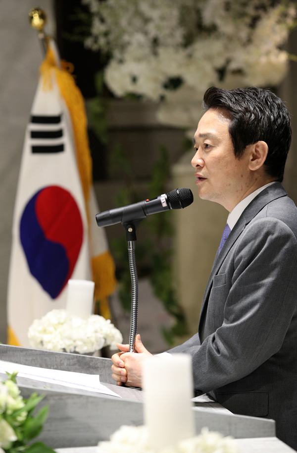 4일 오후 수원 월드컵경기장 내 WI컨벤션에서 열린 '경기도사립유치원연합회 회장 이취임식'에서 남경필 경기도지사가 축사를 하고 있다. /경기도 제공