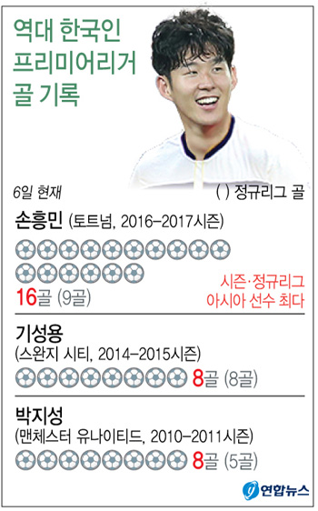 거침없이 득점 행진을 이어간 손흥민은 6일 스완지시티와 경기에서 리그 9호골을 작성, 이번에는 기성용과 함께 보유 중이던 아시아 선수 정규리그 최다골 기록마저 갈아치웠다.