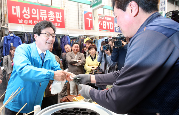 바른정당 유승민 대선 후보가 10일 오전 청주시 육거리시장을 찾아 음식을 사고 있다. /연합뉴스