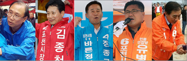 더불어민주당 최호열 후보, 자유한국당 김종천 후보, 바른정당 정종근 후보, 민중연합당 유병권 후보, 무소속 박윤국 후보.(왼쪽부터)