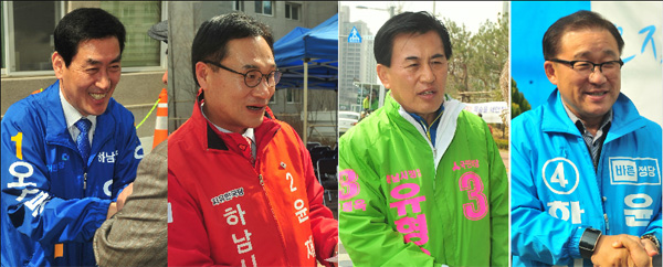 더불어민주당 오수봉 후보, 자유한국당 윤재군 후보, 국민의당 유형욱 후보, 바른정당 윤완채 후보.(왼쪽부터)