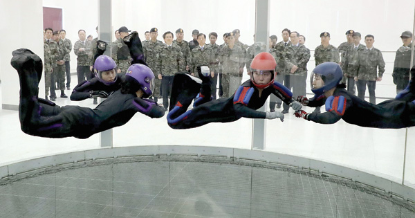 황교안 대통령 권한대행 국무총리가 13일 이천 특수전사령부 고공체험훈련장에서 한민구 국방부장관 등 군 수뇌부와 함께 특수전 대원의 고공모의체험을 참관하고 있다. /연합뉴스