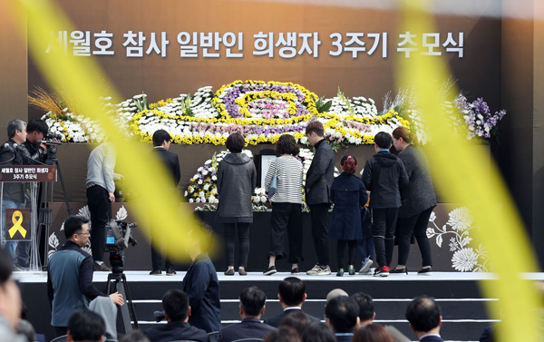 세월호 참사 3주기인 16일 오전 인천시 부평구 인천가족공원 세월호일반인희생자추모관 앞에서 열린 추모식에서 희생자 유가족들이 헌화하고 있다. /연합뉴스