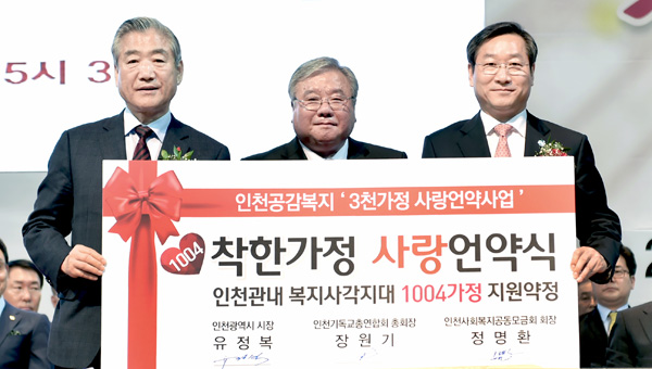 유정복 인천시장이 16일 선학실내체육관에서 장원기 인천기독교총연합회 총회장과 인천사회복지공동모금회장과 함께 ‘1004 착한가정 사랑언약식’에 서명 후 기념촬영을 하고 있다. /인천시 제공