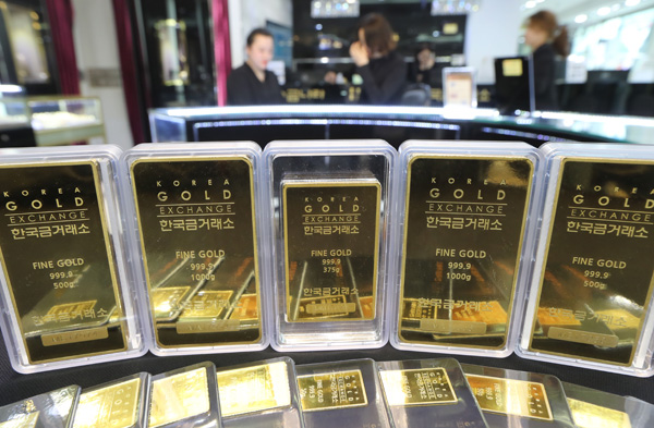 ‘한반도 4월 위기설’이 퍼지자 대표적인 안전자산인 금이 주목 받으면서 골드바 판매가 급증하고 있다. 전날 한국금거래소에 따르면 미니 골드바의 경우 평소 하루 100개 정도에 불과하던 것이 이달 초부터는 300% 급증한 400개 안팎씩 판매되고 있다. 사진은 서울 종로3가 한국금거래소에서 판매 중인 골드바./연합뉴스