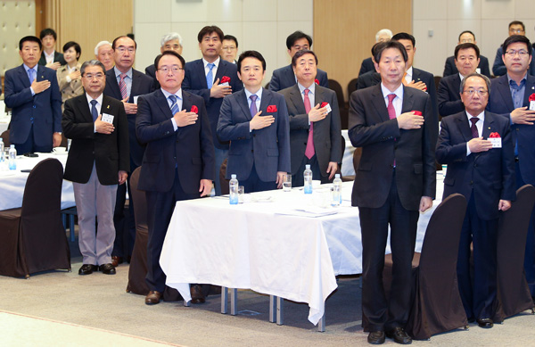 지난 28일 오전 경기도경제과학진흥원 광교홀에서 열린 ‘4월 기우회’에서 남경필 경기도지사와 기우회 회원들이 국민의례를 하고 있다./경기도 제공