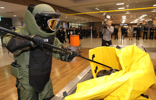 관세청 주관으로 1일 오전 인천공항 입국장에서 열린 ‘세관 테러대응팀 발대식 및 테러물품 적발 모의훈련’에서 폭발물처리반원이 세관에서 적발한 폭발물을 처리하고 있다. /연합뉴스