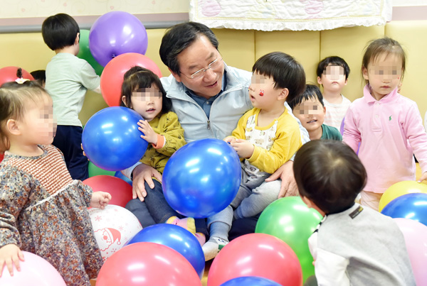 유정복 인천시장이 2일 어린이날을 앞두고 시청 두루미 어린이집을 방문해 어린이들과 풍선놀이를 하고 있다. /인천시 제공