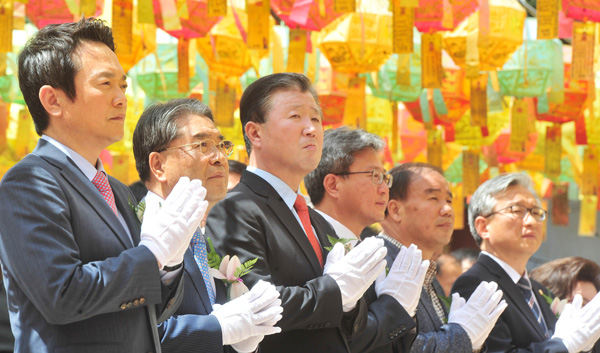 불기 2561년 석가탄신일인 3일 오전 화성시 용주사에서 열린 봉축 법요식에서 남경필(맨 왼쪽) 경기도지사와 이재정(왼쪽 두번째)경기도교육감 등 내빈들이 합장을 하고 있다. /김수연 기자 foto.92@