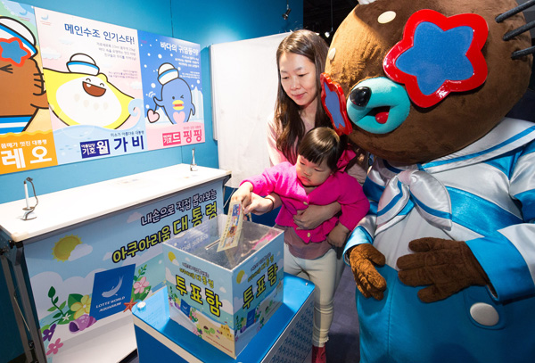 8일 롯데월드 아쿠아리움을 방문한 어린이가 캐릭터 대통령 선출 투표를 하고 있다. 이번 행사는 대선을 앞두고 아이들에게 투표 체험의 기회를 제공해 투표 방법과 절차 등 관련 이해를 돕기 위해 마련됐다./연합뉴스
