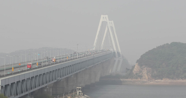 인천지역 미세먼지 농도가 나쁨을 보인 8일 오전 인천국제공항고속도로 영종대교가 미세먼지로 흐리게 보이고 있다. /연합뉴스
