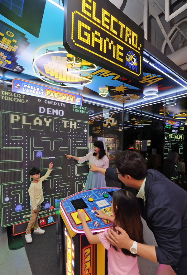 9일 오전 이마트 은평점 일렉트로마트를 방문한 가족이 초대형 게임기로 게임을 즐기고 있다./연합뉴스