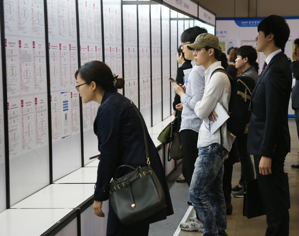 11일 고양 일산 킨텍스 제1전시장에서 개막한 2017글로벌취업상담회에서 구직자들이 채용공고 게시판을 유심히 살펴 보고 있다./연합뉴스