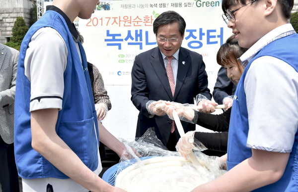 유정복 인천시장이 지난 13일 인천문화예술회관 광장에서 열린 ‘2017 자원순환 녹색 나눔장터’ 행사에서 주요귀빈과 관계자들과 함께 가래떡을 커팅하는 퍼포먼스를 하기 위해 떡을 받고 있다. /인천시 제공