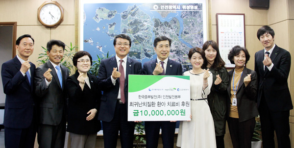 15일 시청에서 열린 ‘한국중부발전㈜ 인천발전본부, 희귀난치질환 환아 치료비 후원금 전달식’에서 윤경현 한국중부발전㈜ 인천발전본부장(왼쪽 네번째부터), 전성수 행정부시장, 박은숙 초록우산 어린이재단 본부장이 후원금 전달식을 갖고 있다. /인천시 제공