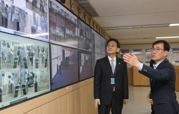 이창재 법무부 장관 직무대행이 17일 오후 U-20 월드컵 개막을 앞두고 대테러 대응 태세 점검을 위해 인천국제공항을 방문, 출입국심사지원센터에서 출입국 관리 현황을 점검하고 있다. /연합뉴스