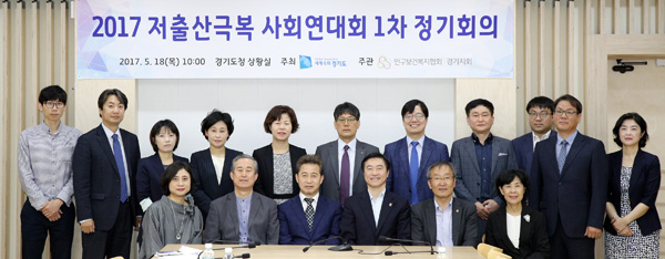 18일 오후 경기도청 상황실에서 열린 '2017 저출산극복 사회연대회 1차 정기회의'에서 이재율 경기도 행정1부지사가 참석한 관계자들과 기념촬영을 하고 있다. /경기도 제공