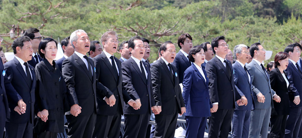 문재인 대통령과 여·야 지도부 등 참석자들이 18일 오전 광주 국립 5·18 민주묘지에서 열린 제37주년 5·18 민주화운동 기념식에서 ‘님을 위한 행진곡’을 함께 부르고 있다. /연합뉴스