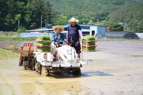 지난 19일 광주시 도척면 친환경 무농약 쌀 생산 시범단지에서 열린 친환경 쌀 생산 확대 보급을 위한 모내기 시연행사에 참석한 조억동 시장이 이양기를 직접 운전하며 모내기를 하고 있다. /광주시 제공