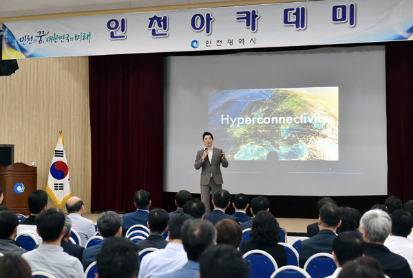 23일 시청 대회의실에서 열린 ‘제95회 인천아카데미’에서 7 HONORS 켄트김 대표가 ‘초연결 시대의 시공간 공감혁명’을 주제로 강연을 하고 있다. /인천시 제공