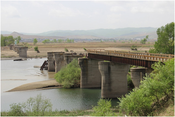 다리우에서 멀리 동쪽을 바라보면 조선에서 유명한 왕재산혁명유적기념탑이 보인다. 서쪽 다리밑에는 일렬로 백양나무를 심어 국경으로 정한 온성도가 보인다. 물길이 갈라진 덕인지는 몰라도 강폭이 좁은 물길은 비취색과 견줄만할 정도로 투명하고 짙푸른 물빛을 자랑하며 흐르고있었다.