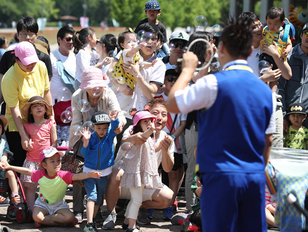 지난 27일 과천 서울대공원에서 열린 아동학대 예방 연합 캠페인 행사를 찾은 어린이와 부모들이 비눗방울 축하공연을 관람하고 있다./연합뉴스