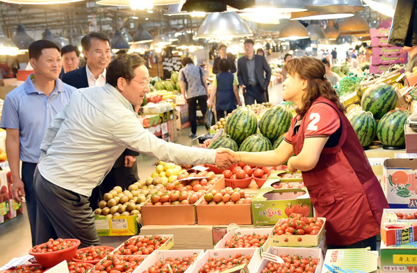 유정복 인천시장이 29일 삼산농산물도매시장을 방문해 상인들을 격려하고 애로사항을 청취하고 있다. /인천시 제공