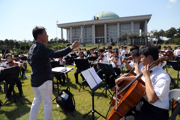 4일 오후 서울 여의도 국회 잔디광장에서 노원유스챔버오케스트라의 연주회가 열리고 있다. /연합뉴스