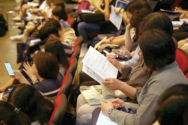 6일 오전 성남시 가천대학교 예음홀에서 2018학년도 수시 적성고사 설명회가 열렸다. 사진은 설명회에 참석한 수험생과 학부모가 설명자료를 꼼꼼히 읽는 모습. /가천대 제공