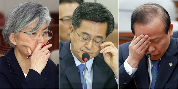 7일 국회에서 열린 강경화 외교부 장관 후보자(왼쪽부터), 김동연 부총리 겸 기획재정부 장관 후보자, 김이수 헌법재판소장 후보자에 대한 인사청문회에서 여야 위원들의 질문에 각 후보들이 힘든 표정을 짓고 있다. /연합뉴스