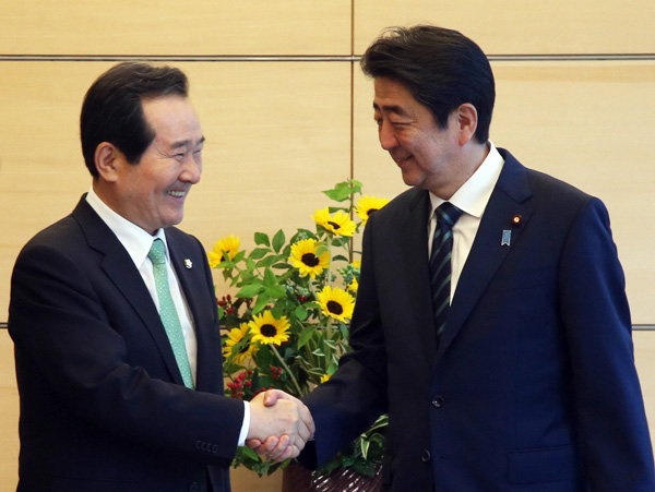 정세균 국회의장(왼쪽)이 8일 일본 도쿄 총리 관저에서 아베 신조 일본 총리와 만나 악수하고 있다. /국회대변인실 제공