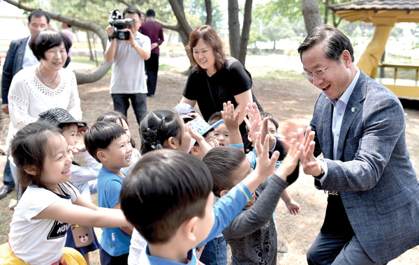 현장학습 나온 어린이들과 ‘양손 하이파이브’