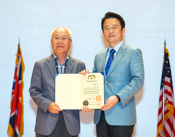 25일 오전 경기도경제과학진흥원 3층 경기홀에서 열린 6.25전쟁 제67주년 기념식에서 남경필 경기도지사가 참전유공자 박태우 옹에게 국가유공자 증서를 전달하고 있다./경기도 제공