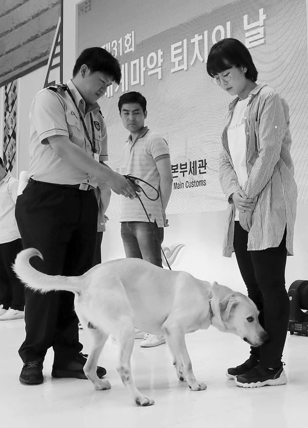 지난 23일 오후 인천시 중구 인천국제공항에서 열린 ‘인천본부세관 세계 마약퇴치의 날 기념행사’에서 마약탐지견 ‘산’이 마약을 소지한 여행객을 찾아내는 시연을 하고 있다. /연합뉴스
