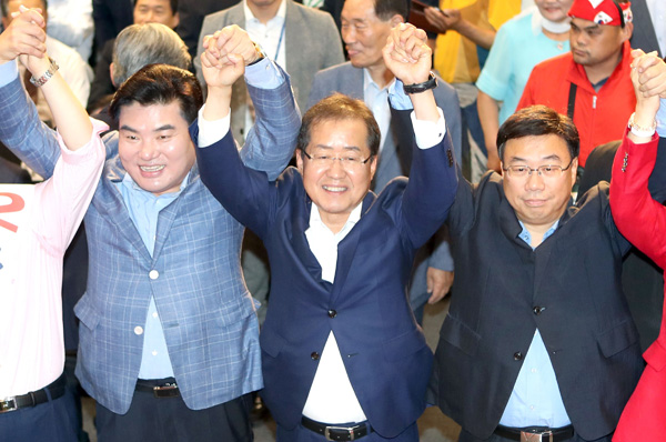 자유한국당 당대표 후보들이 25일 오후 부산항국제여객터미널 컨퍼런스홀에서 열린 부산·울산·경남 합동연설회에서 손을 들어 인사하고 있다. 왼쪽부터 원유철, 홍준표, 신상진 후보. /연합뉴스