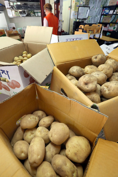 가뭄과 폭염으로 밭작물 수확량이 줄면서 양파, 감자 등의 농산물 가격이 들썩거리고 있다. 양파 1㎏ 가격은 1년 전보다 27.2%(422원) 오른 1천975원에 거래됐고, 노지 감자는 1㎏당 2천910원에 팔리고 있다. 재배면적은 지난해와 비슷하지만, 가뭄 탓에 작황이 15%가량 감소한 것으로 분석된다. 사진은 26일 서울시 영등포구 청과물 재래시장 도ㆍ소매점./연합뉴스