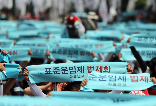 화물연대 조합원들이 지난 1일 오후 서울 여의도 산업은행 앞에서 화물노동자결의대회를 열고 표준운임제 법제화와 지입제 폐지를 등을 촉구하고 있다. /연합뉴스