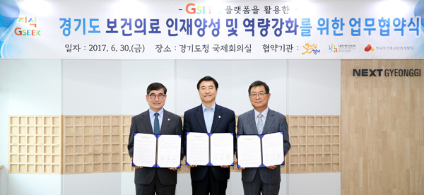 경기도 보건의료 인재양성 및 역량강화 업무협약 체결식이 지난달 30일 도청 국제회의실에서 열려 이재율 경기도 행정1부지사(가운데)가 최영현 한국보건복지인력개발원장(왼쪽), 정영진 경기도병원회 회장과 협약서를 들어보이고 있다./경기도 제공