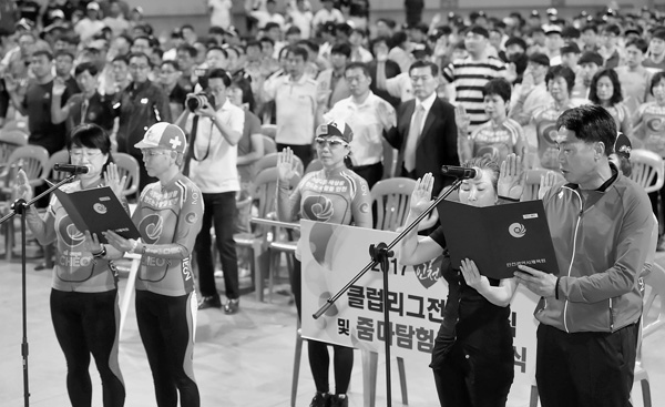 2일 선학체육관에서 열린 ‘2017 인천사랑 클럽리그전 개회식 및 줌마탐험대 발대식’에서 선수단 및 줌마탐험대 대표들이 선서를 하고 있다. /인천시 제공