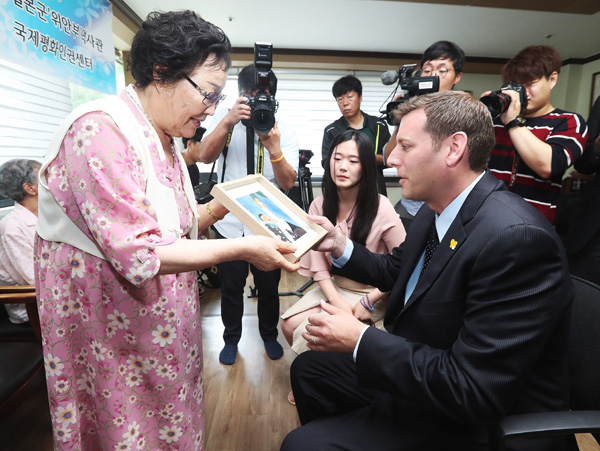 에드워드 브라운스타인 미국 뉴욕주 하원의원이 5일 오전 광주시 퇴촌면 일본군 위안부 피해 할머니들의 쉼터 나눔의집을 방문해 이용수 할머니에게 김순덕 할머니가 그린 그림 ‘끌려감’을 선물받고 있다. /연합뉴스