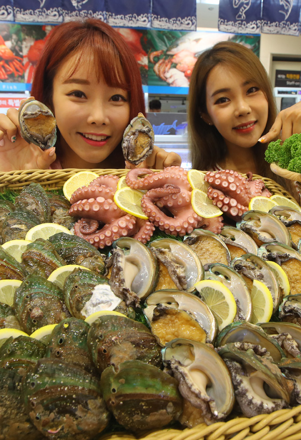 초복을 이틀 앞둔 10일 오전 서울 중구 롯데마트 서울역점에서 모델들이 국내산 전복을 선보이고 있다. 롯데마트는 보양식으로 좋은 국내산 냉장 전복 5마리를 1만2천500원에 판매한다./연합뉴스