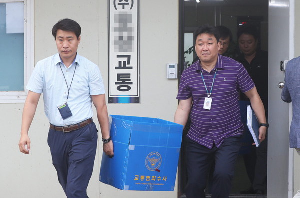 서울지방경찰청 교통범죄수사팀이 경부고속도로 신양재나들목 인근에서 발생한 광역버스 졸음운전 사상사고와 관련, 11일 오산시 해당 버스업체 사무실을 압수수색하고 압수품을 들고 나오고 있다./연합뉴스