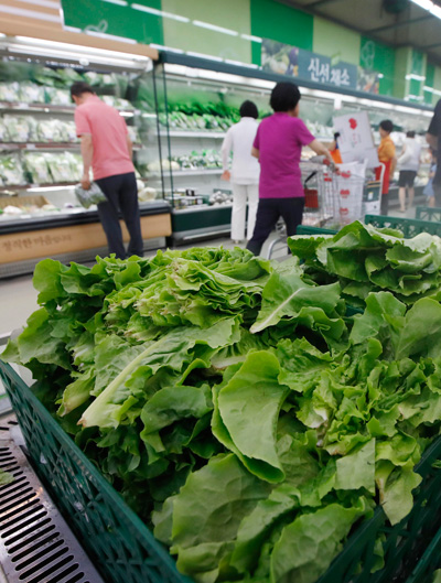 게릴라성 폭우 피해 여파로 상추와 채소 가격이 급등했다. 사진은 23일 오후 서울 시내 한 대형마트에 진열된 상추./연합뉴스