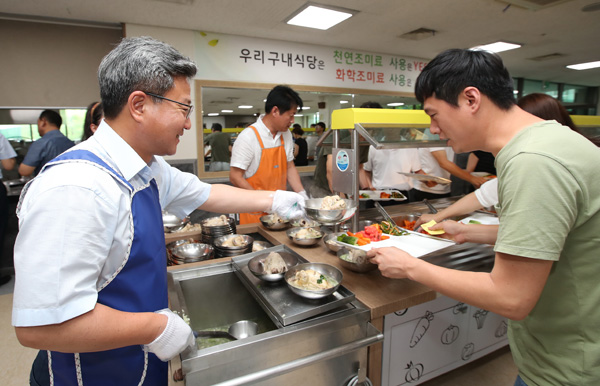 채인석 화성시장을 비롯, 황성태 부시장 등이 지난 21일 중복을 맞아 시청 구내식당에서 직원들에게 삼계탕을 배식하고 있다. /화성시 제공